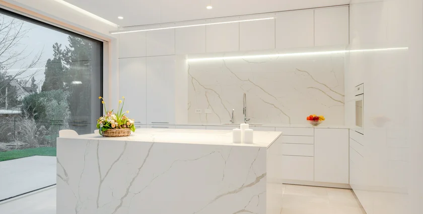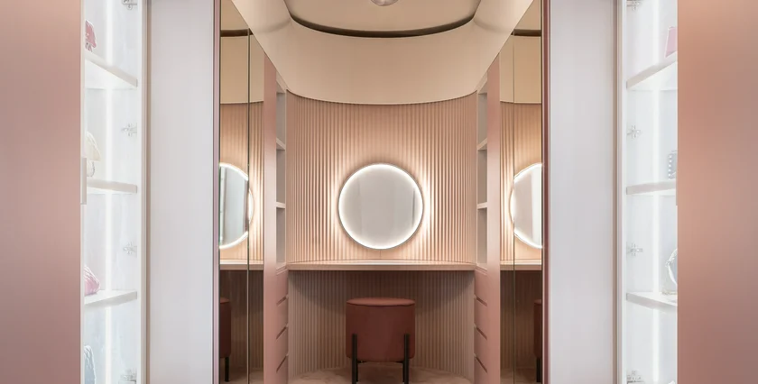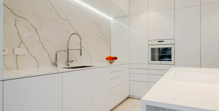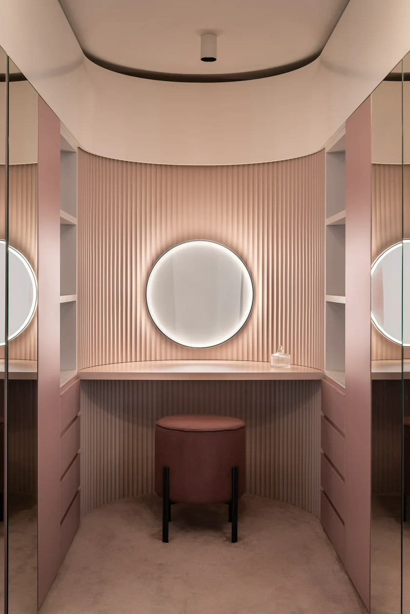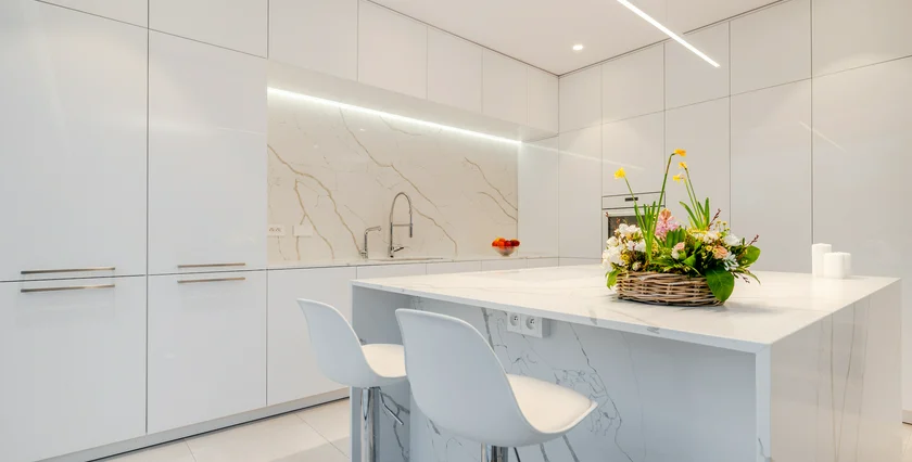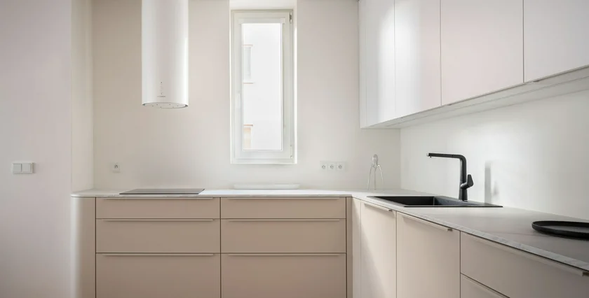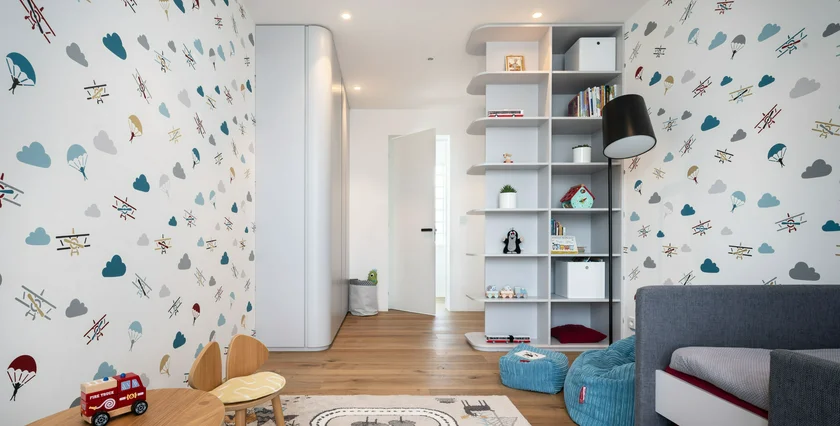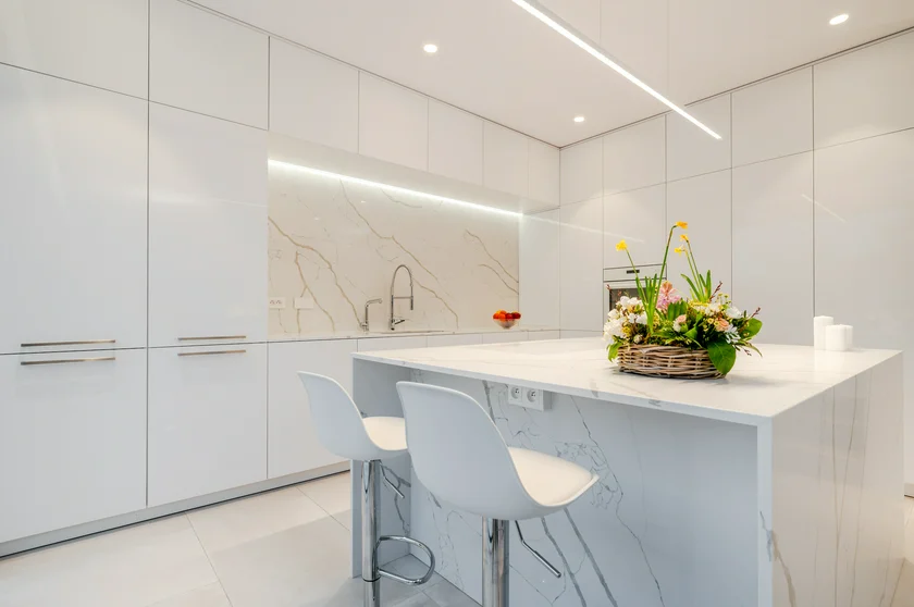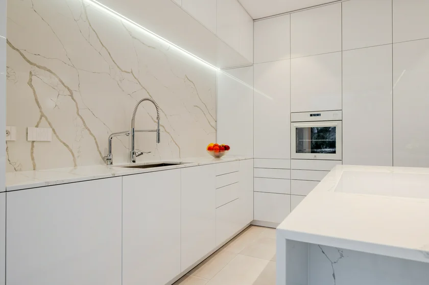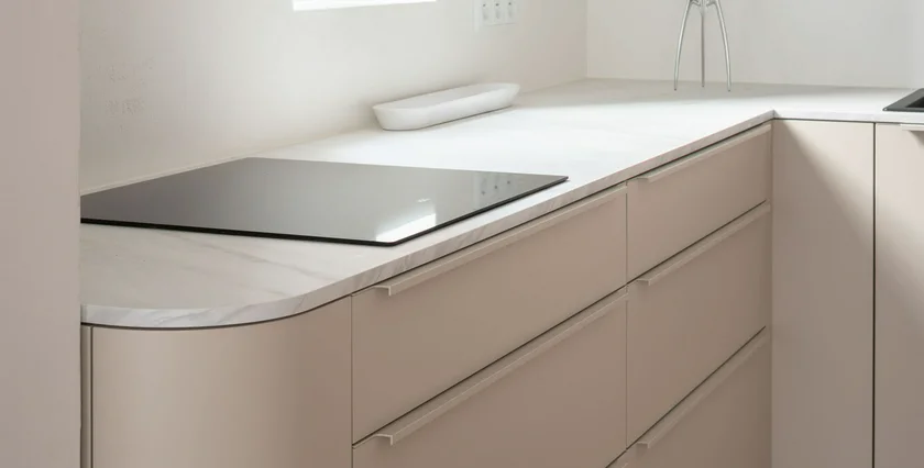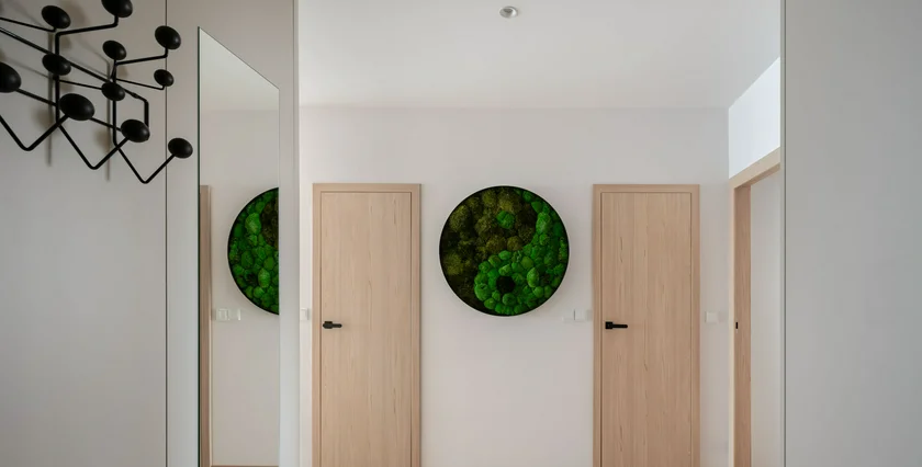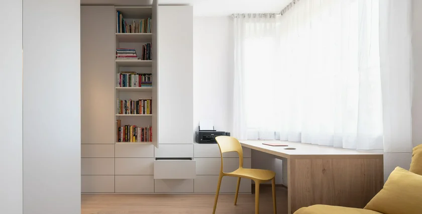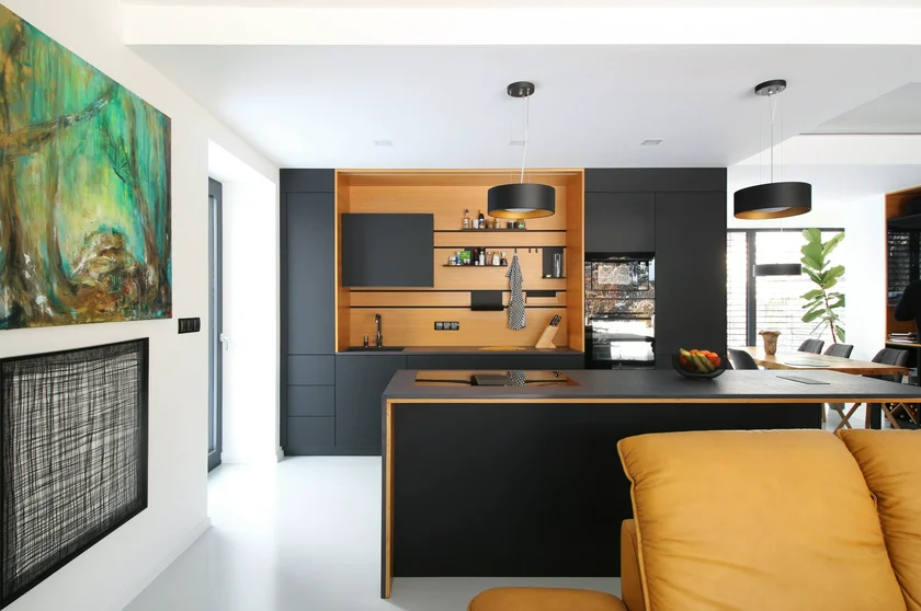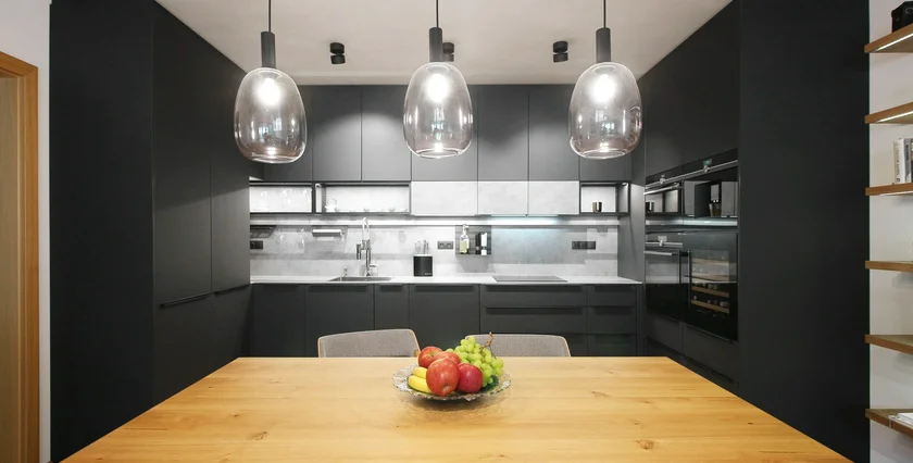 For one recent completion – an apartment in Prague’s Kateřinky district – the clients wanted to create an open, airy, well-lit space, dominated by beige and white tones. Casa Moderna opened up the space by knocking down the partition between the living room and the hallway, allowing natural light to pour in from the windows. The use of the rounded corners of the built-in wardrobes and kitchen cabinets softens and seamlessly connects the kitchen and living area.