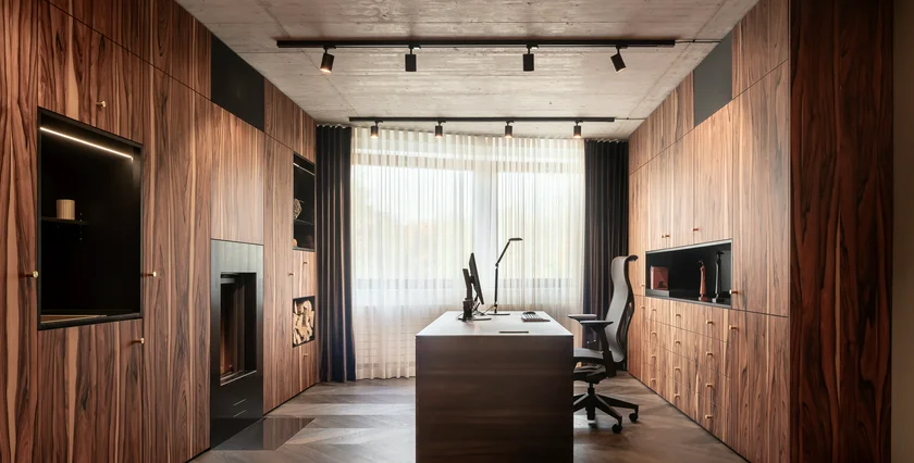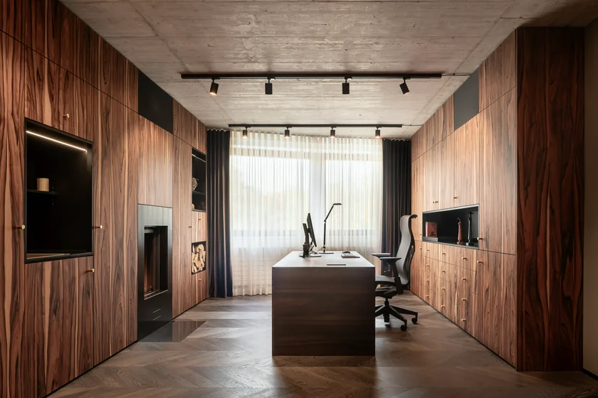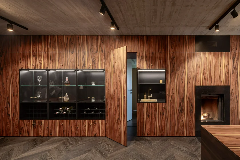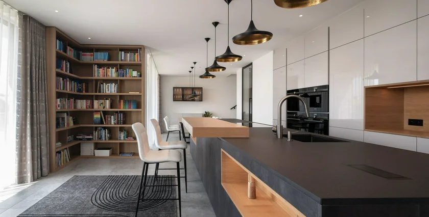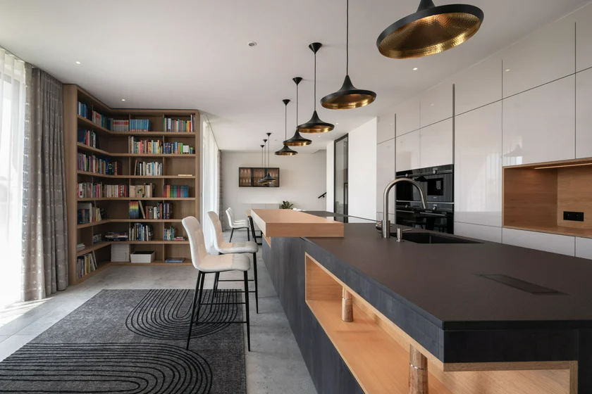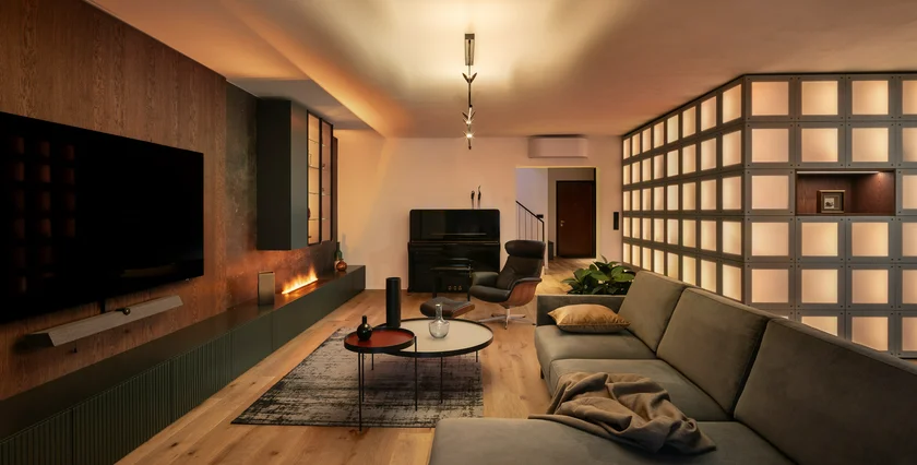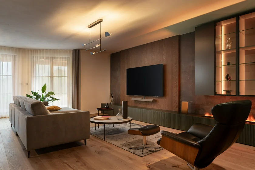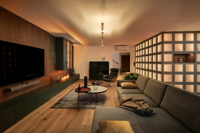 The custom built-in furniture in the living room, study and kitchen come from Dílna Šesták, as did the hanging bookcase with integrated LED lighting and the TV chest.