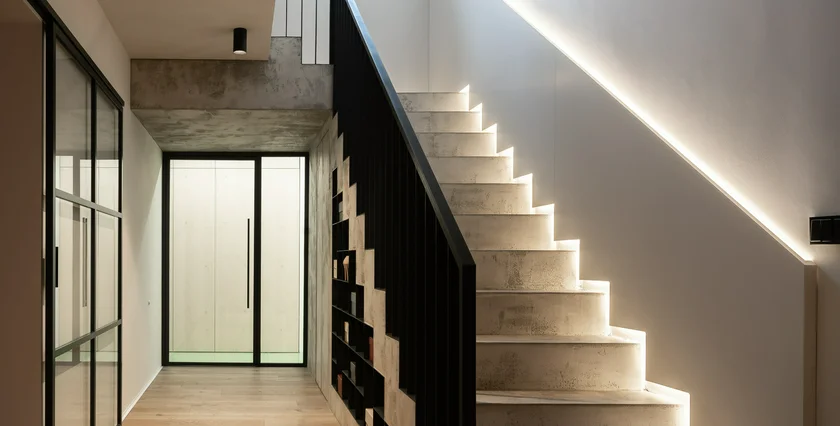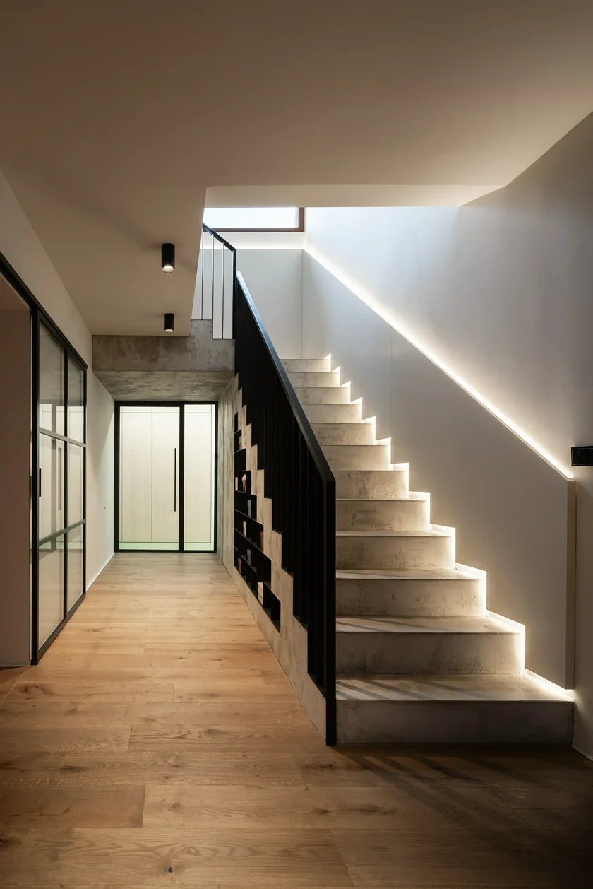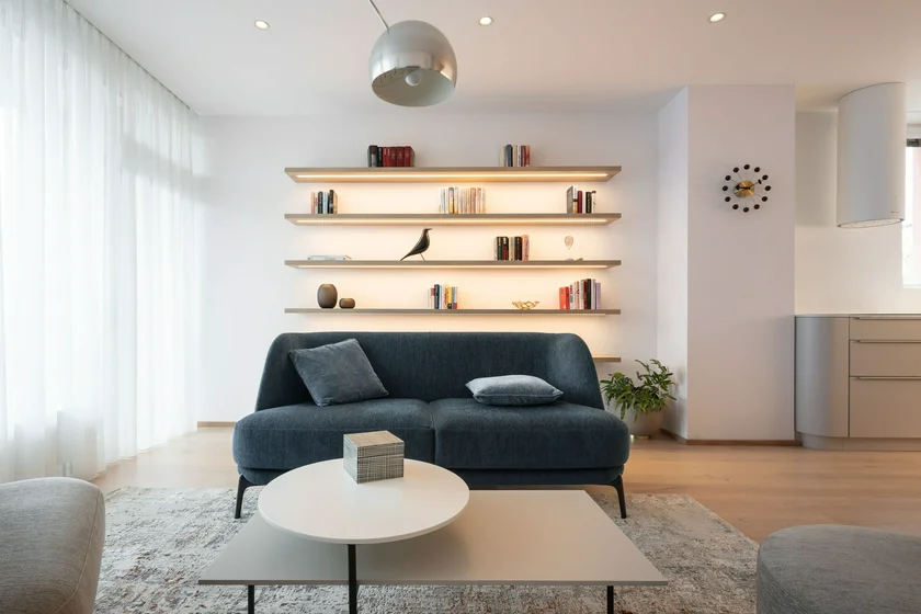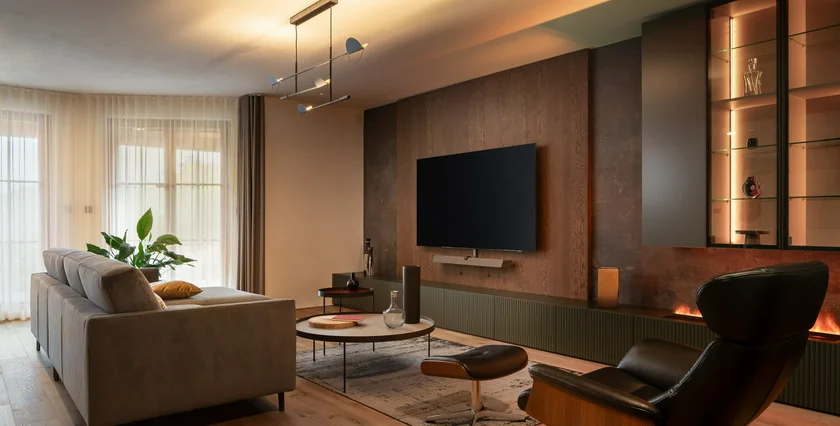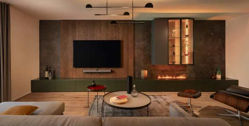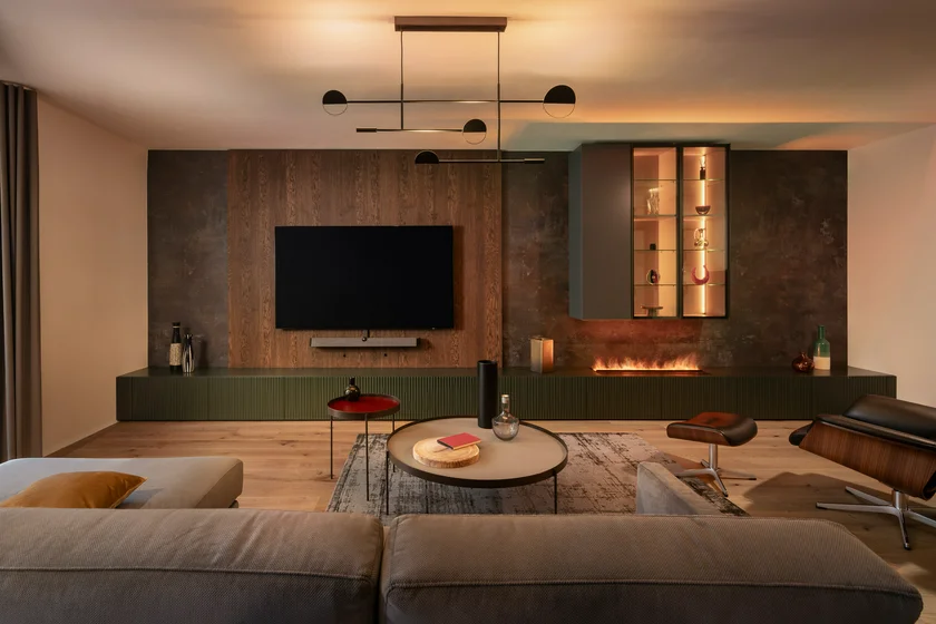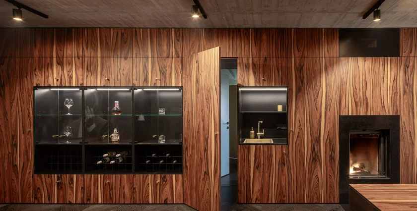 The custom built-in furniture in the living room, study and kitchen come from Dílna Šesták, as did the hanging bookcase with integrated LED lighting and the TV chest.