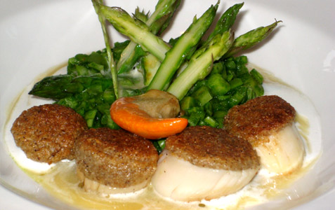 First, three of the four scallops were very small. Second, those three were also slightly overcooked. There was too much toughness to the flesh. The fourth one was larger and, perhaps because of its size, was cooked correctly. It was much more delicate and tender.