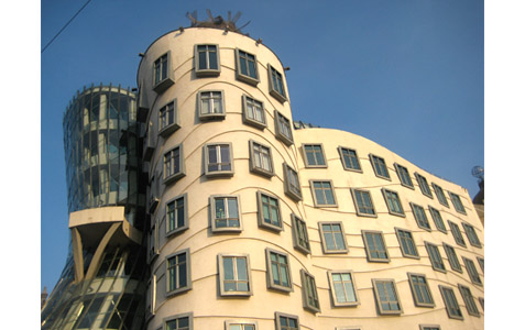 This architectural landmark is known as the “Dancing House.” And “Fred and Ginger.” And the Nationale-Nederlanden building after the bank that commissioned it.