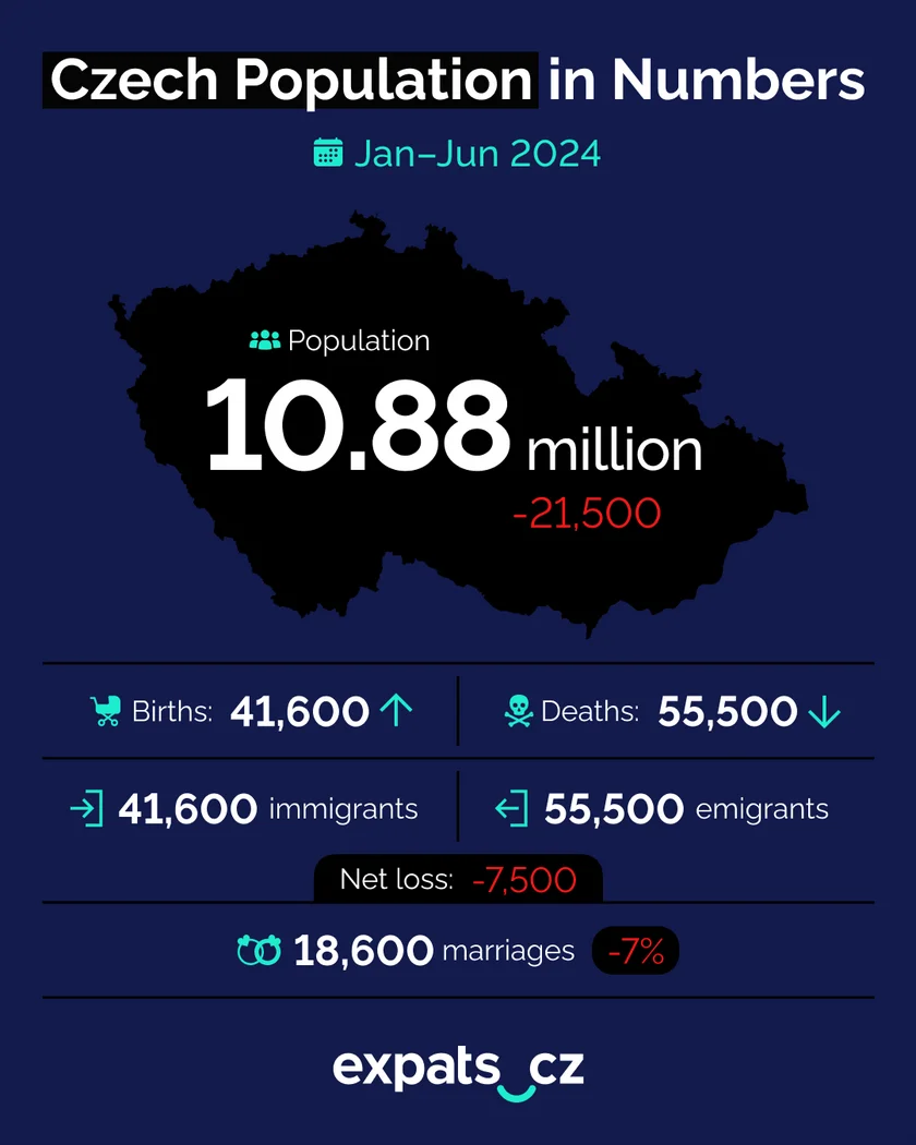 Only 62,700 people immigrated to Czechia in the first half of 2024, a 13,800 decrease from last year. Meanwhile, around 55,500 people died during the same period, 3 percent fewer than the previous year. This means that more people are leaving the country than are coming in, and more people are dying than being born.