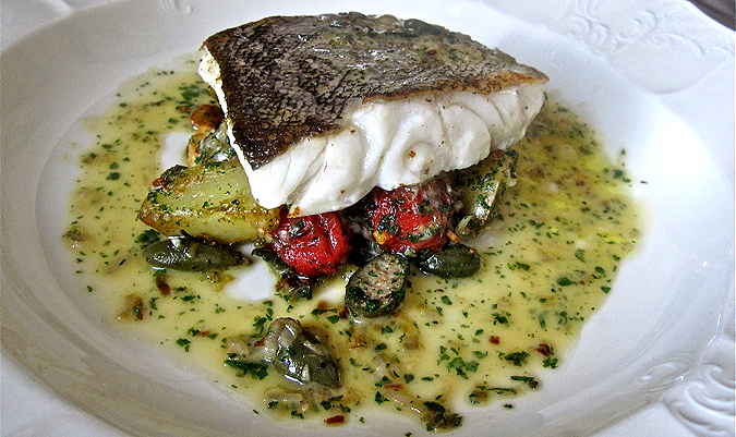 It came with roasted potatoes, capers, homemade dried tomatoes. There was a light white wine sauce. The fish was fresh and light, the vegetables well-executed, and the sauce tasted fine.