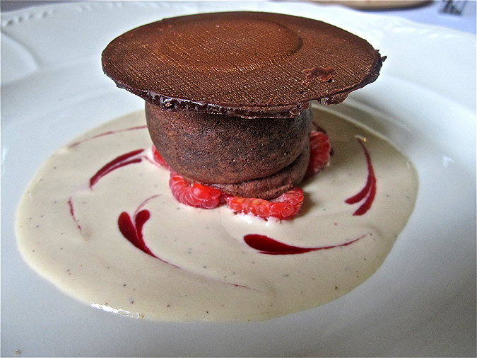 For dessert, I had the chocolate fondant with raspberry and cream, and a glazed chocolate wafer (390 CZK).