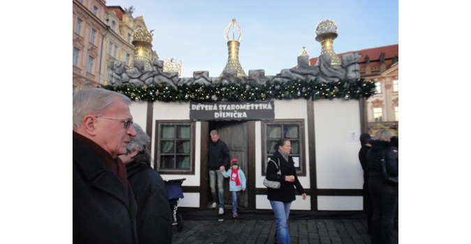 One of the things to see is a crèche of live animals – a donkey, some sheep and goats, and a gorgeous furry pony, who doesn’t seem to mind all the little kids stroking him constantly. Inside the building that butts onto the crèche is a “dílna”, or crafts workshop, where kids can write letters to Ježíšek and cut snowflakes. It’s nicely heated and a welcome break from the madness. Click here for the daily program of live performances.