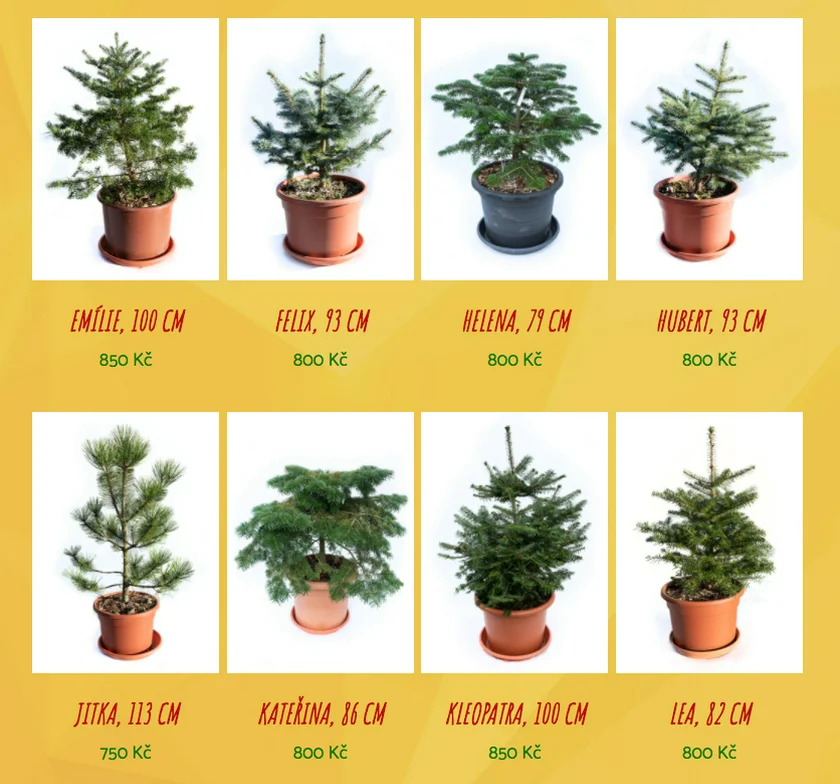 - pujcovnastromku.cz – tree rental service. Choose from their selection online, they will deliver and pick it up after the holiday. Prices start at CZK 700.