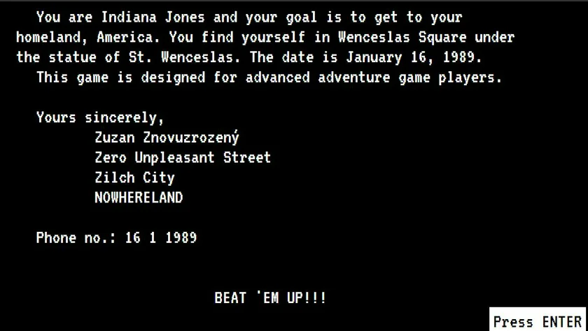 The Adventures of Indiana Jones in Wenceslas Square in Prague on January 16, 1989 is certainly a relic of its time. People used to fast-scrolling rendered 3D images and noisy action will likely find the game, which uses only typed commands from a short list, a bit quaint. To play the games, people had to take notes to keep track of what items they had picked up, and make maps with pen and paper.