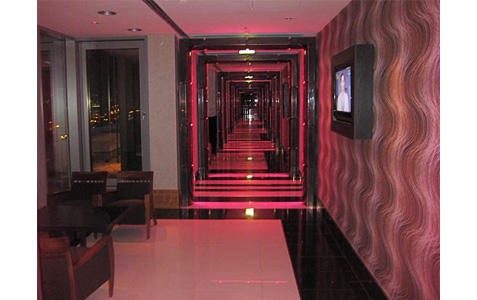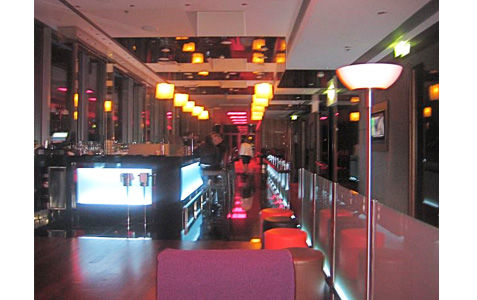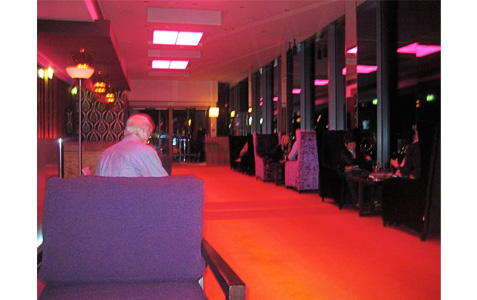 I turned right past a well-dressed, well-muscled door man and walked into the purplish-hot pink seating area.