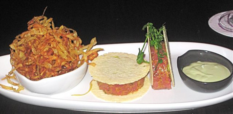 The menu mentioned tomato, but I didn’t see or taste any. Perhaps it blended in too well with the red tuna. The wasabi cream on the side was pleasantly sharp and a little sweet, but I used it sparingly. The batter-fried onion strings on the side weren’t bad, but very messy and awkward to eat.