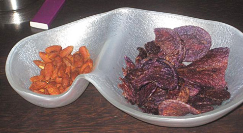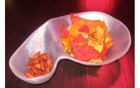 The chips, which were a wide variety of shapes, sizes and colors, appeared homemade. The waitress told me they were all potato, but they all had different flavors, from slightly sweet to salty to spicy. There were also slightly sticky sweet and salty almonds.