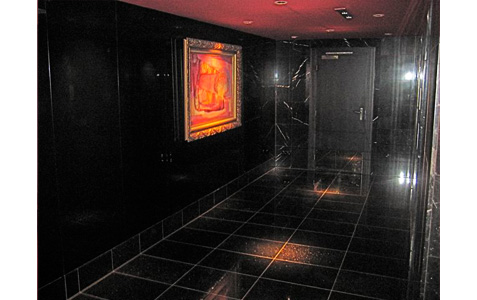 The other night, I walked into the atrium and eventually found the special mirrored elevator up to the roof. I came out into a dark black marble hallway.