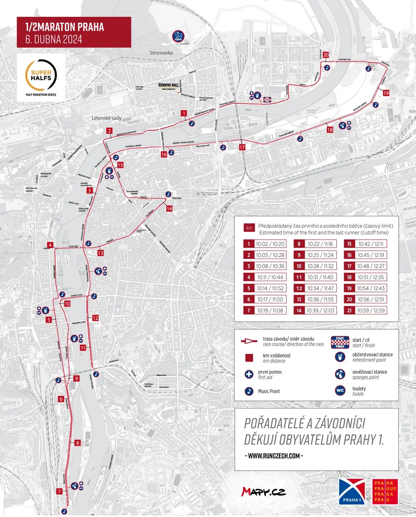 The race, now in its 10th year, will start and finish on Bubenské nábřeží next to the Holešovice Market in Prague 7. The 21-kilometer course will cross through Prague 1, 2, 5, 7, and 8, following the banks of the Vltava River.