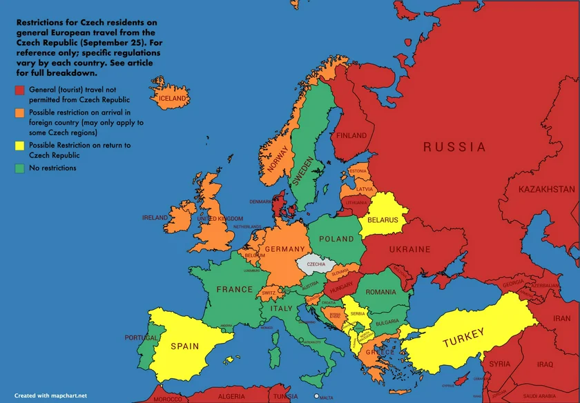 Cyprus: From September 18, Cyprus has elevated the Czech Republic to its highest list of risk countries, barring general travel from the country. More info here.