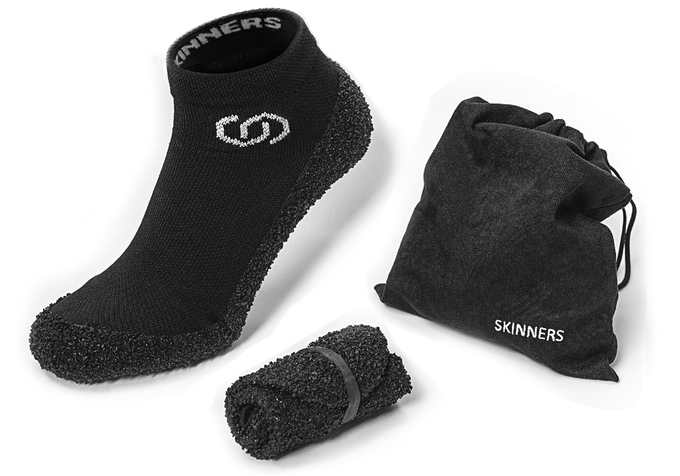 But the bottom is where the item truly comes alive: a unique sandal-like, ultra-flexible sole that is hand-crafted in the Czech Republic. It provides the durability of a shoe, but allows Skinners to be folded up like socks for easy transport.