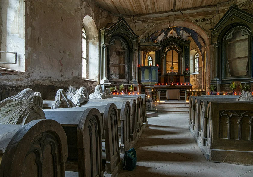 The turnaround in the collapsing building’s fate began in 2012 when art student Jakub Hadrava put sculptures of ghostly shrouds seated in the pews of the Church of St. George (Kostel svatého Jiří) in the small town of Luková in the northern Plzeň region. The project was his bachelor’s thesis and officially has the title “My Mind” (Má mysl).