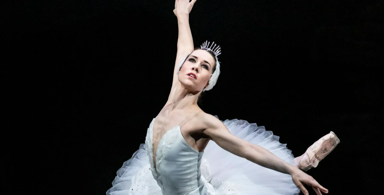The photograph captures a pivotal moment from the second act of the classical ballet work, Odette's first meeting with Prince Siegfried.