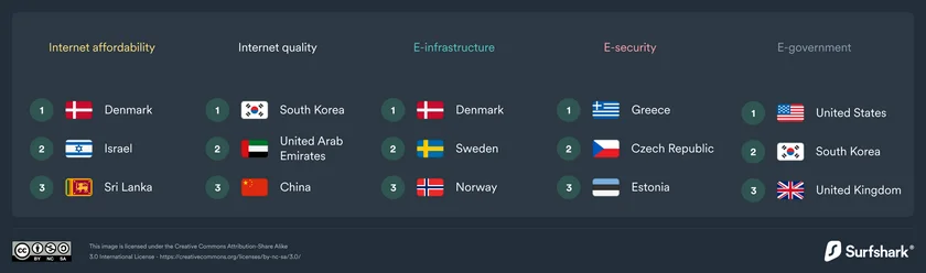 The Digital Quality of Life survey, conducted by cybersecurity company Surfshark, found Denmark, South Korea, and Finland to be the three countries with the best digital environments. The survey evaluated five areas: the availability of internet connection, the quality of connectivity, existing digital infrastructure, digital security, and eGovernment (the management of public affairs using modern technologies).