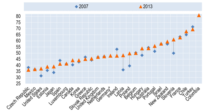 Based on percentage of the median wage, Czech Republic ranks slightly behind Mexico, the United States, Estonia, and Japan. Among those countries, the Czech Republic is the only one that has seen a decrease in minimum wage levels since 2007.