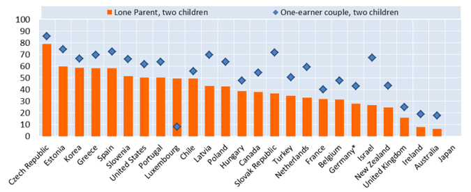Australia and Ireland rate highest here: a single parent with two children will need to work less than 10 hours per week to stay above their country’s poverty line.