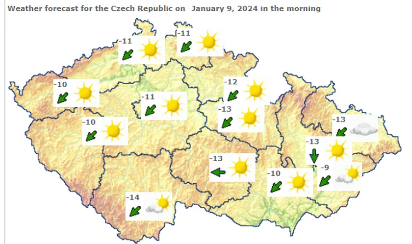 Almost all the country will see its coldest weather of the week on Wednesday morning. As well as Prague seeing temperatures of minus 12 degrees, Ostrava is set to register minus 14 degrees Celsius. Brno will get temperatures of about minus 10 degrees Celsius. Although the weather will warm up as the day progresses, temperatures will again remain below zero – hovering between minus 2 and minus 4 degrees in Czechia’s major cities.
