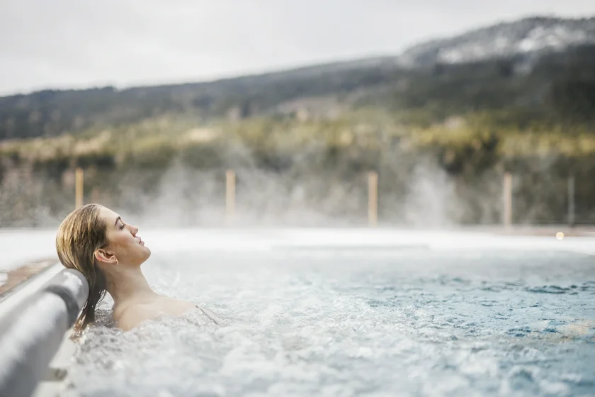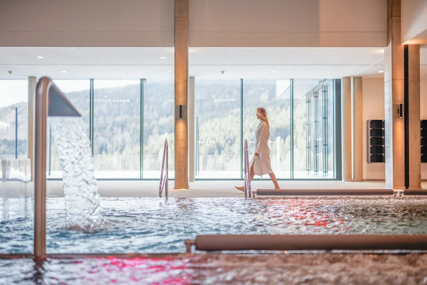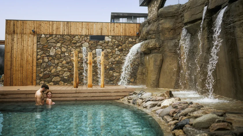 Inside, pools include massage benches, water jets, and geysers, while two dedicated swimming lanes allow for uninterrupted laps alongside relaxation zones. The outdoor swim-through pool runs year-round, letting you float directly from indoor warmth into open mountain air.
