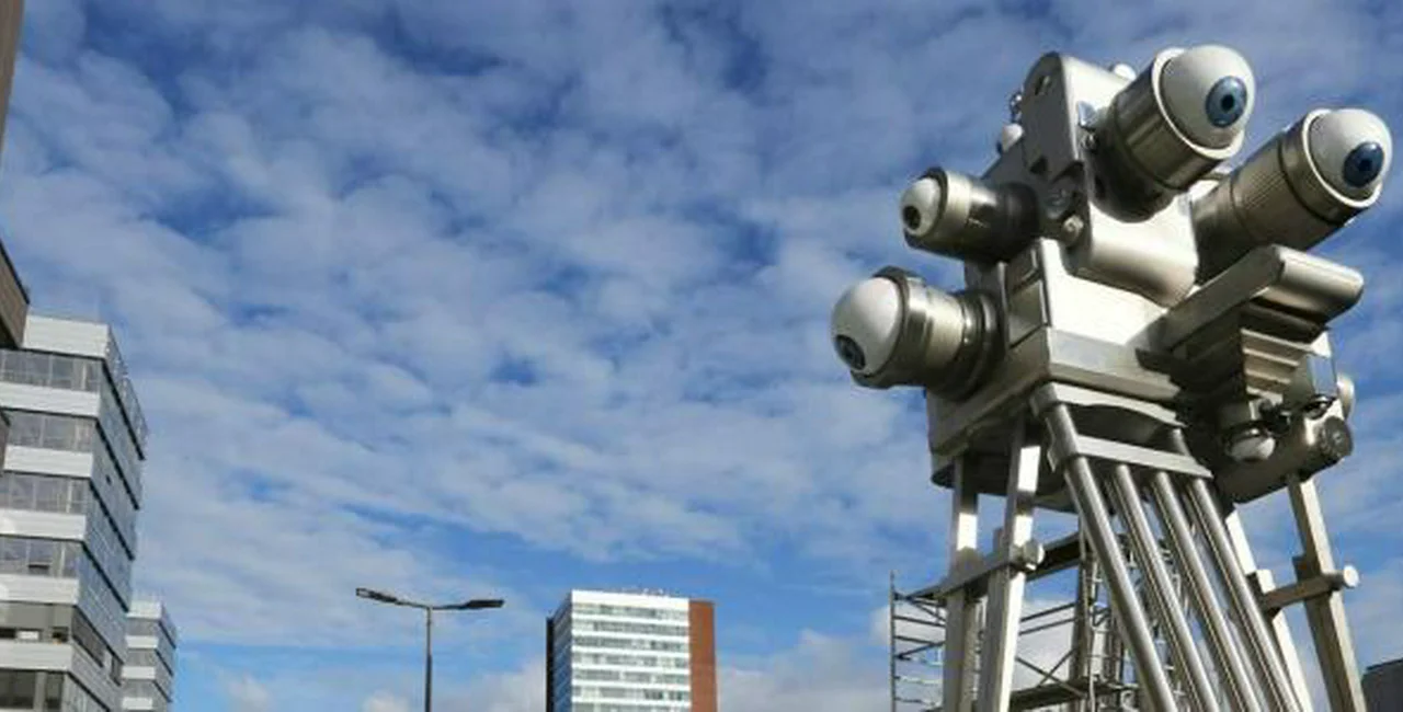 Located outside the gallery on the promenade, the interactive sculpture, “Trifot”, is like something out of sci-fi novel in both form and function; equipped with video cameras it captures the images of bystanders and projects them onto a screen.