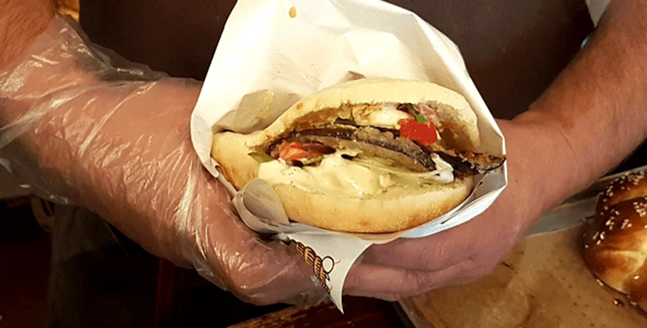 The Nofech version of this Iraqi-Israeli hybrid is served in a puffy locally-sourced pita filled with lightly fried eggplant, hardboiled egg, three varieties of Israeli salad, pickles, tahini, and hummus.