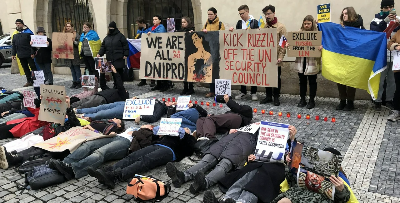 Over 50 people protested Sunday in front of a UN building in Prague 1 against a Russian rocket attack on a residential building in Dnipro, Ukraine. About 45 people died and 43 were injured following the strike, according to Ukrainian President Volodymyr Zelenskiy.