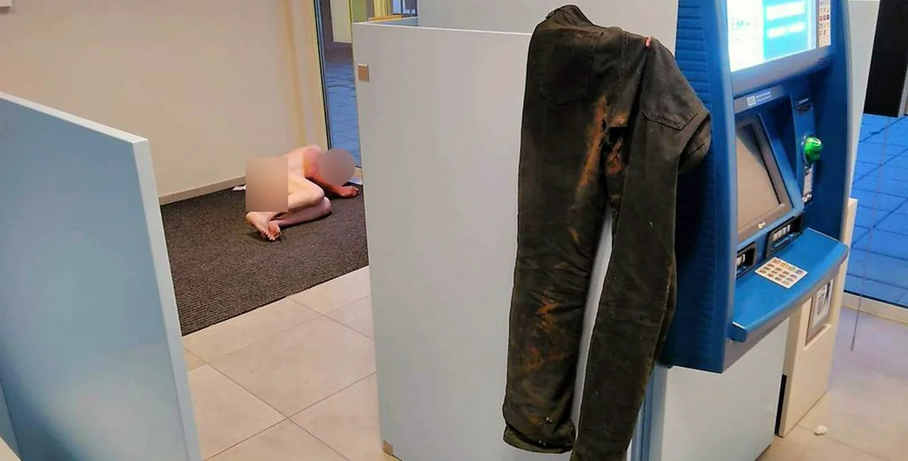 Inside the bank doors he discovered a man sleeping naked on the ground, his pants draped over the ATM and shoes and socks on the radiator.