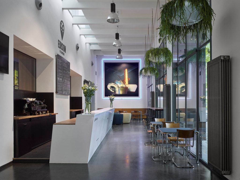 Edison Filmhub is located in a functionalist building, featuring state-of-the-art projection equipment, comfortable armchairs, and a design café. It is the very first cinema that opens not only as a traditional cinema but also a video-on-demand platform, or “virtual video rental,” says Hronec.