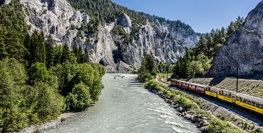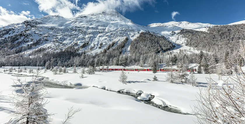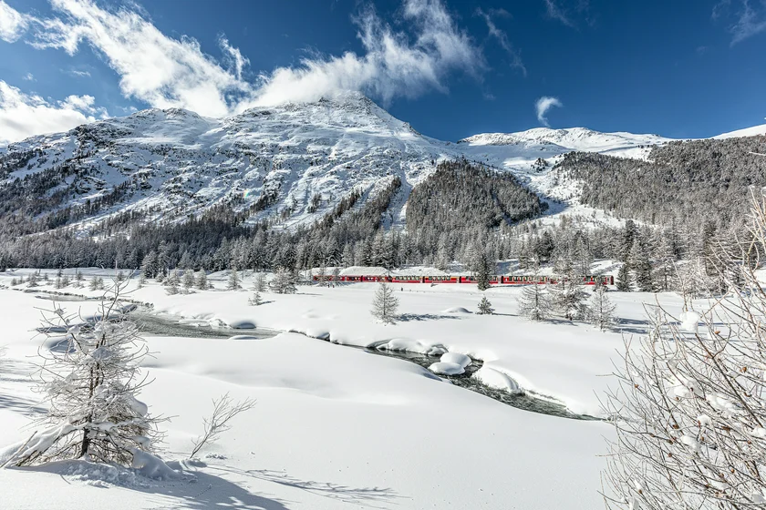 This panoramic train journey, connecting Chur – the oldest town in Switzerland – to the Italian town of Tirano along one of the highest railway tracks in Europe, passes snow-covered gorges and glaciers, winding its way through 55 tunnels and over 196 bridges. The route traverses the famed six-arched Landwasser Viaduct as well as numerous other awe-inspiring landmarks like Lago Bianco, which sits 2,253 meters above sea level, the Montebello curve, the Alp Grüm, and the Brusio Circular Viaduct.
