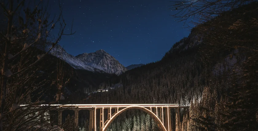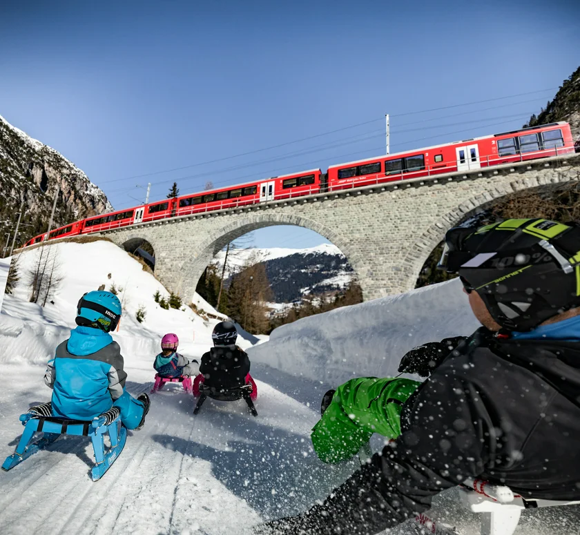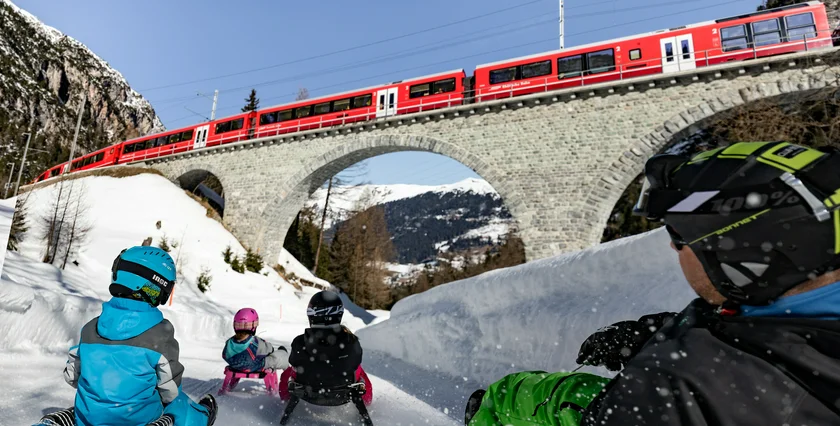 There are two key sled runs in the Albula Valley. The more family-friendly route begins at Preda, while a faster, more hardcore route begins in Darlux. Both routes end in the charming village of Bergün. The 6 km Preda-Bergün route, spanning more than 6,000 meters, is favored by families and beginners who prefer its easy- to medium-level twists and turns. As an added treat, the run stays open later in the evening for a few nights each week, allowing visitors to sled down an illuminated route until 11pm. Rhaetian Railway will drop you off at the starting point.