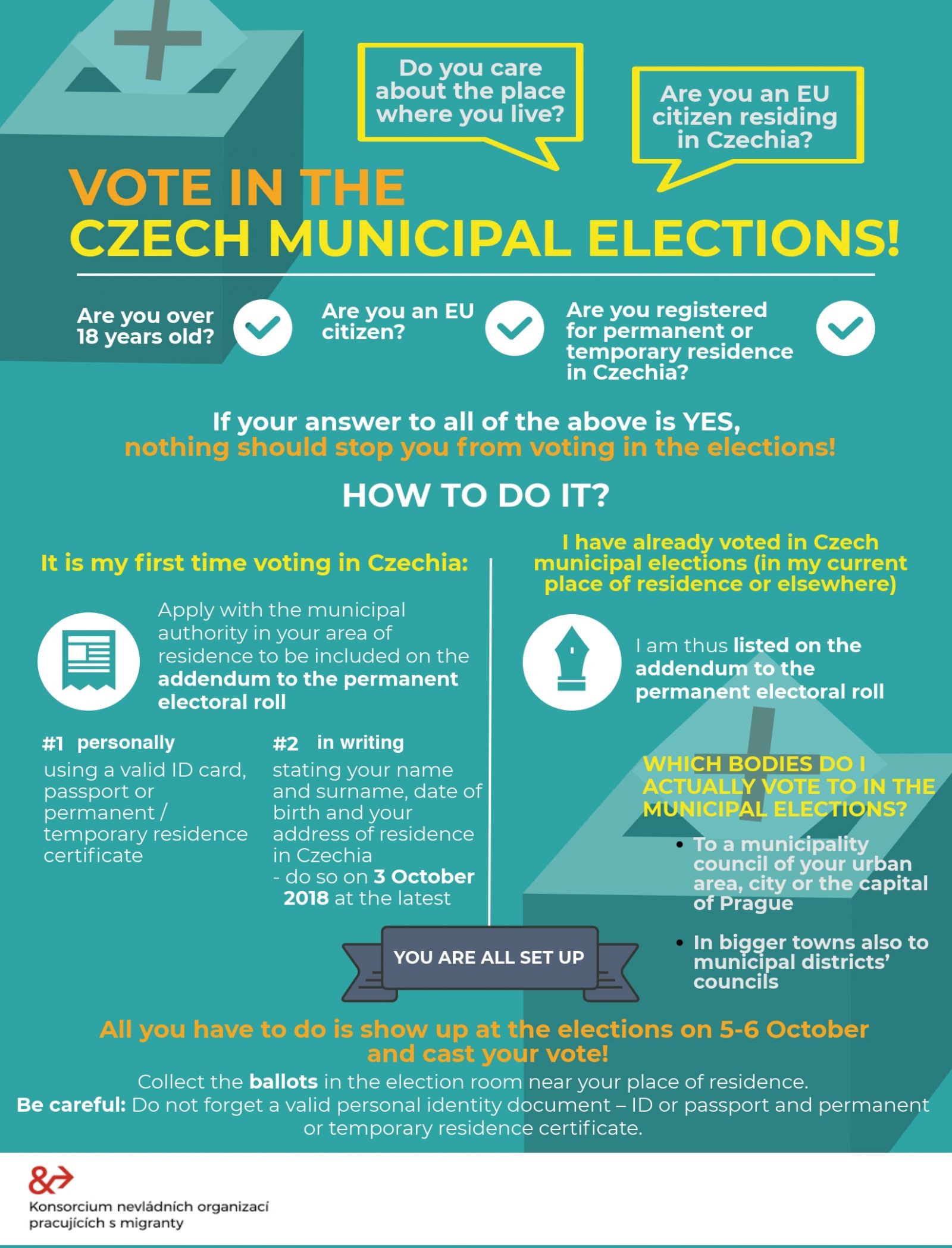 This handy infographic provided by the Consortium of Migrants Assisting Organizations in the Czech Republic lays out the process of voting as a foreigner in the local Czech elections: