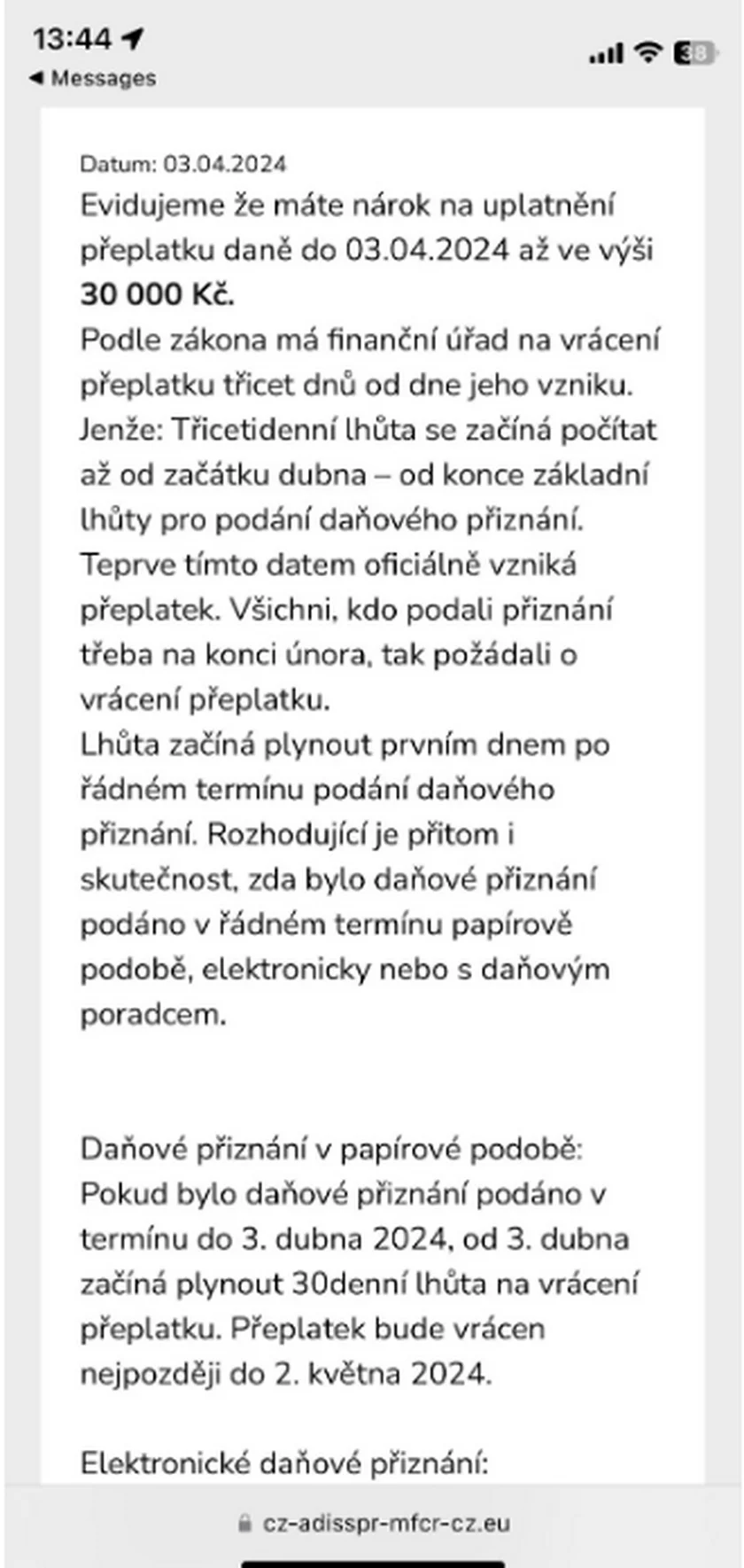 After clicking on the link, she saw a highly realistic-looking webpage pretending to be the Tax Office. A long message told her that she was owed CZK 30,000 and would receive this amount within 30 days from the beginning of April. The faux website mentioned that this was due to the paper tax return deadline elapsing in early April – presumably as a way to make the fake rebate seem more legitimate.