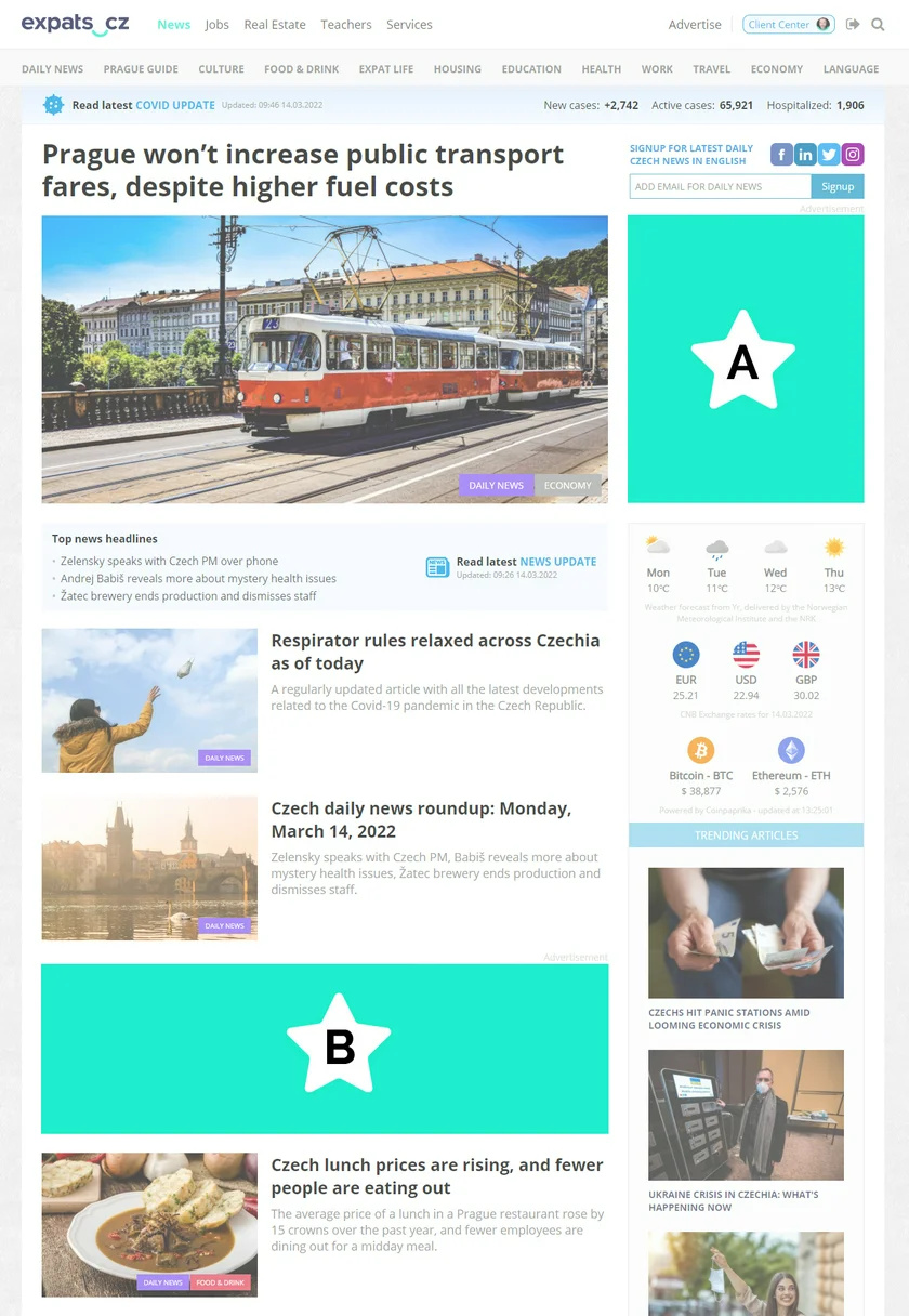 In-Article banners are placed inside our daily news and feature content and provide high visibility for our regular visitors. Your brand or service will be known by our readers due to this product's high visibility. Select additional specific categories for targeted placement such as News, Prague Guide, Culture, Food & Drink, Expat Life, Housing, Education, Health, Work, Travel, Economy or Language.
