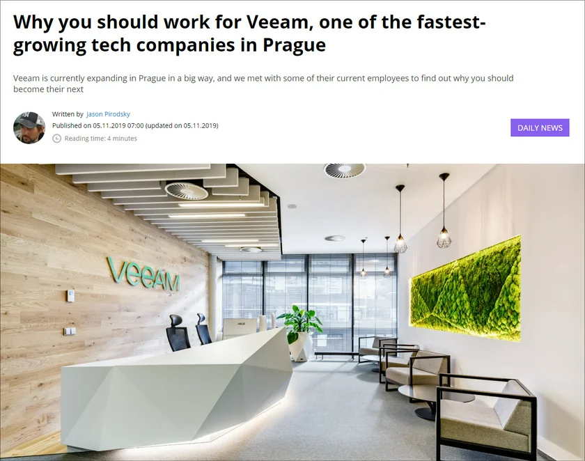 We wrote a series of articles for Prague-based tech company Veeam, one of the world’s leading private software firms and leaders in backup solutions, when the company was in the midst of a major Prague expansion. The articles presented a behind-the-scenes look at working for the firm via interviews with employees, videos, and other strong visual and storytelling elements. Article links throughout led directly to the company's hiring page.