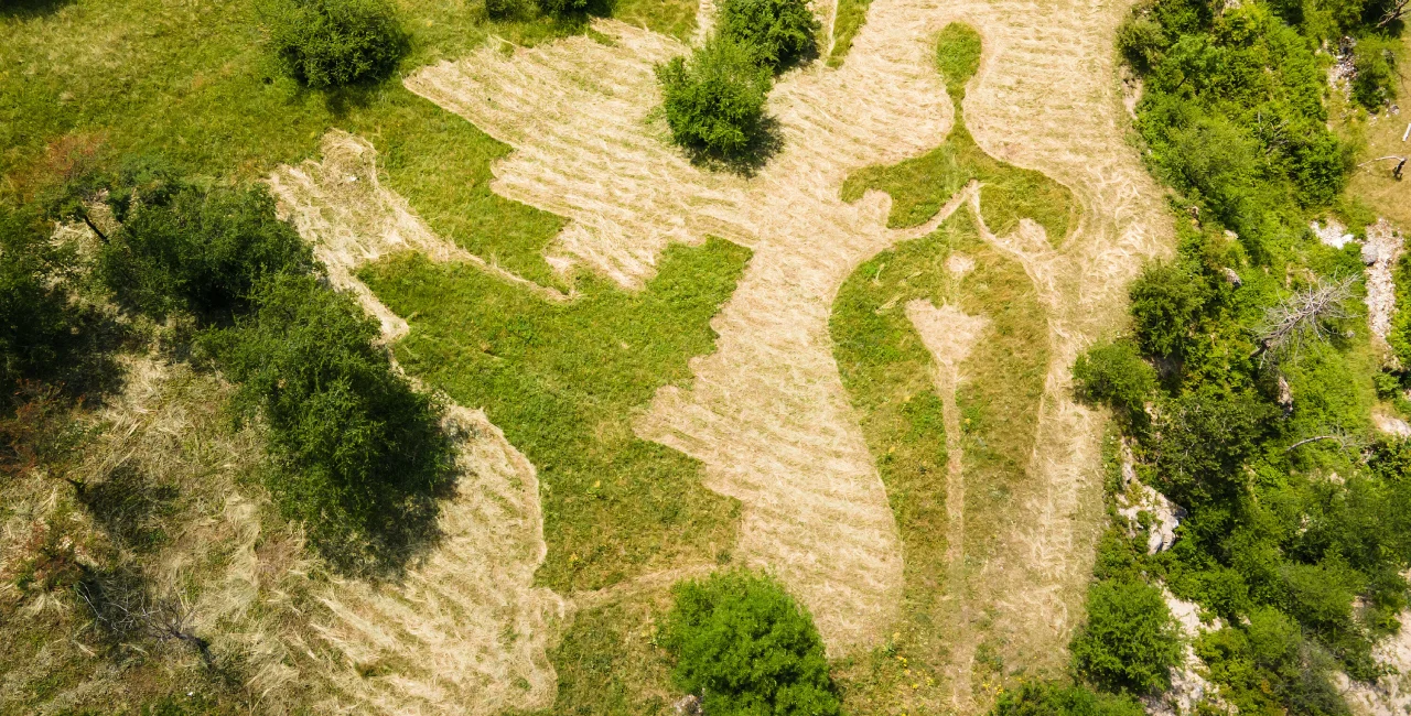 CHKO Pálava hired an independent contractor to carry out the mosaic mowing, but did not specify which portions of the field to leave intact. They were surprised to find the creative solution the mower found, which is not visible from ground level but can be viewed from the sky as well as nearby hills.