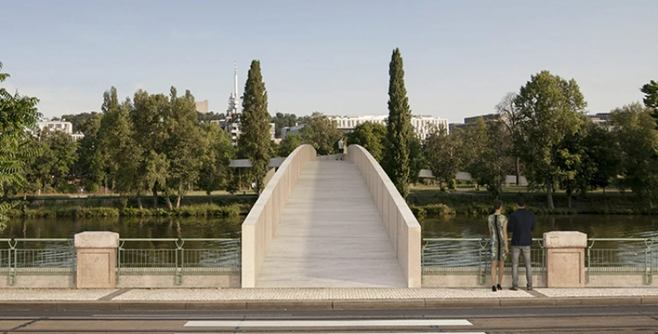 IPR described the bridge concept as a spatial curve winding through the landscape and reacting smoothly to the terrain. “The concept of bridge construction responds humbly to the panorama of Prague, to the Holešovice and Karlín shores and to the winning urban design of the Štvanice island. … The bridge architecture uses minimalist sculptural morphology. The bridge is made of ultra-high-performance concrete (UHPC) with a glossy white marble surface,” IPR said.