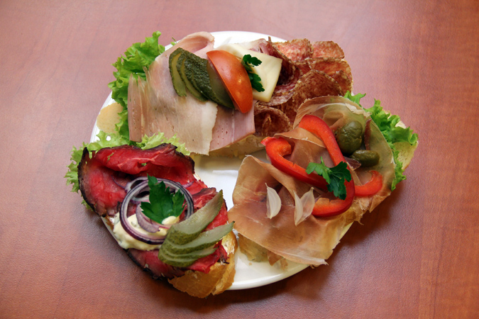 “Czech Painter Jan Skramlík, indisposed on a ladder at the time, asked Mr. Paukert to prepare a snack that would fit into his hand.” The original open-faced sandwich allegedly featured Swiss cheese, Hungarian salami, and a “domestic” mayonnaise, invented by Paukert, the recipe for which died along with its creator in 2010.