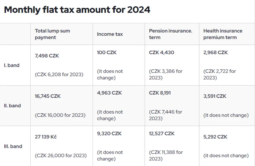 Those who are in the first band of the flat-rate tax will in 2024 pay a set CZK 7,498 monthly, up from CZK 6,208 in 2023. This year, CZK 4,430 will go towards social insurance, CZK 2,968 towards health, and CZK 100 for personal income tax. This translates to an annual payment of almost CZK 90,000 per year.