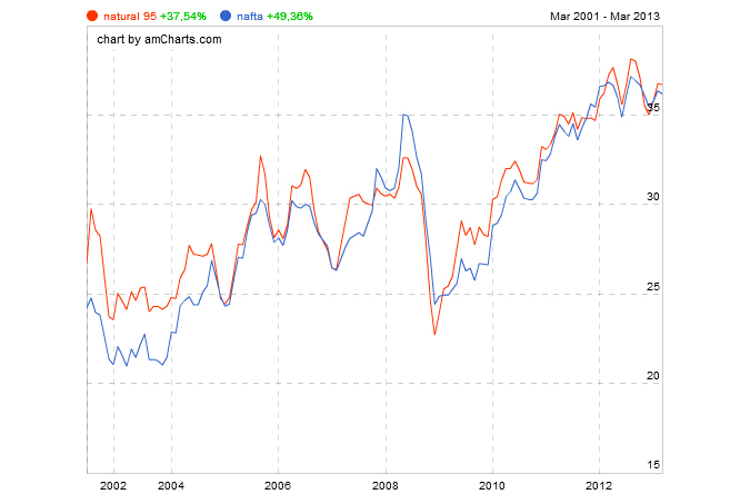 The price of fuel in the Czech Republic has been rising relatively steadily for many decades. The following graph illustrates the developments from 2001 until March 2013. It is clear, despite the dips in the price in 2009 (due to higher supply than demand), that the price continues to grow. Much of this has to do with growing demand in the Asian markets, which have been pushing demand up and resulting in an increased price for this commodity.
