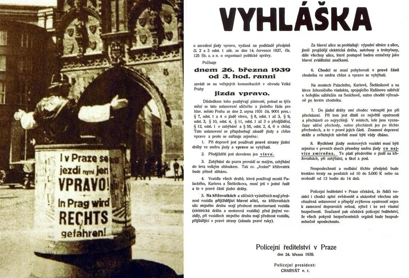The occupation brought one change that is still in use. Before the occupation, people drove on the left side of the road. Czechoslovakia had agreed to eventually switch in 1925, and in 1931 said they would do so in five years, but did not do so. The change to driving on the right took place starting on March 15 in Ostrava, with Prague joining on March 26. It took trams a bit longer to be adapted.