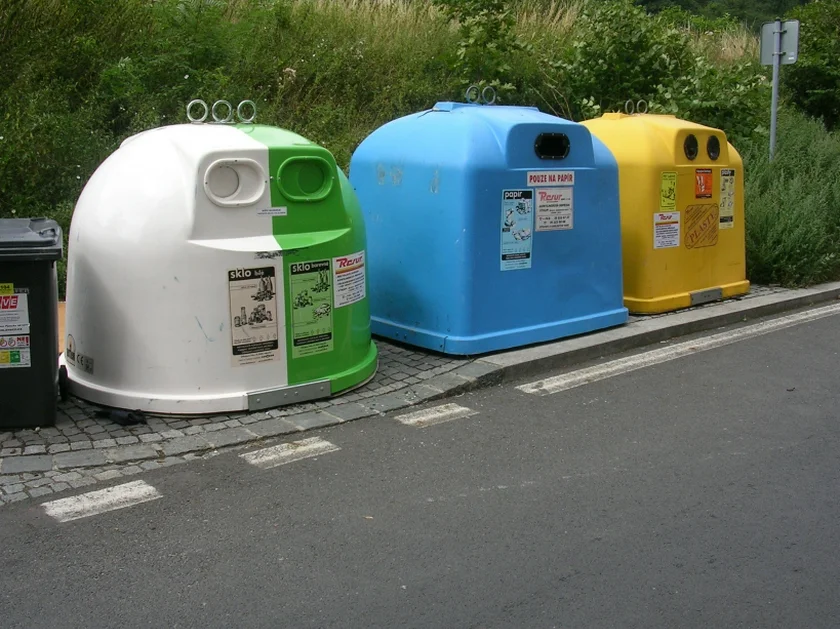 There are many points in Prague where residents can find a set of colored bins, usually in blue, yellow, green, white, brown, or marked with an orange sticker.