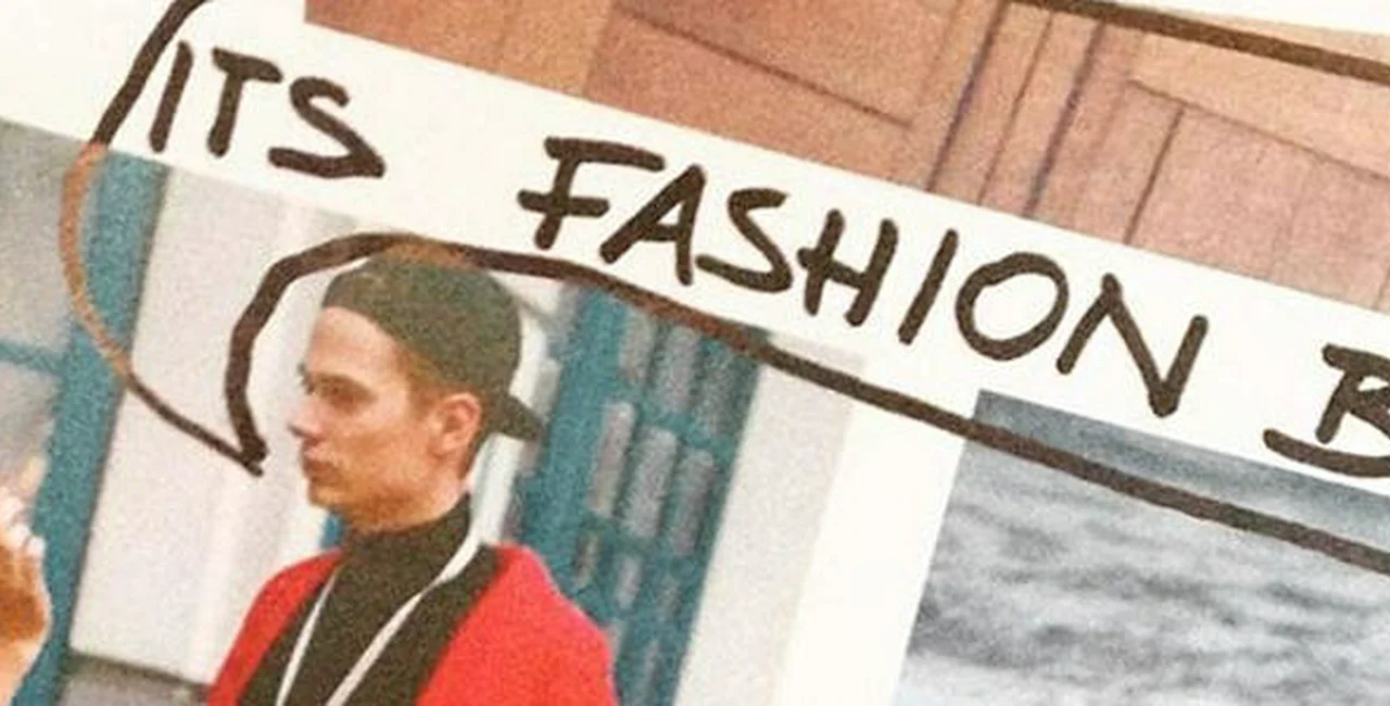 “ITS FASHION BABY,” a speech bubble drawn on the photo attributes to the man.
