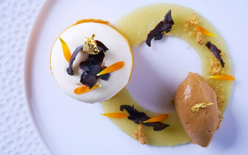 The second course features foie gras, celery marinated in hazelnut oil, and buckwheat popcorn with vanilla and cognac. The pièce de résistance is the Waldorf dessert, made with fermented apples. Kohút slow-cooks the apples at 60°C for 60 days. From this, he creates a pudding with raisins, nuts, and ice cream topped with a slightly acidic juice.