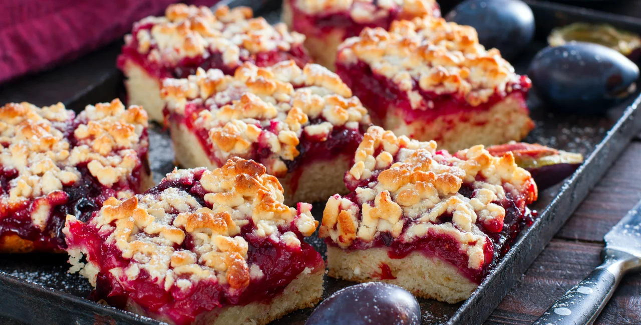 This classic cake recipe gets its foundation from a quick-and-easy yeast-based dough, and the remaining ingredients, mainly local, seasonal fruit, are layered into a baking tin (plech) and finished with a crumble. The result is a really moist, sweet cake tempered with tart plums.