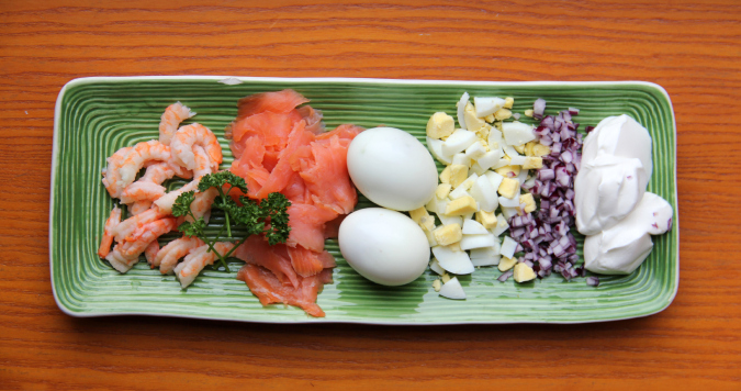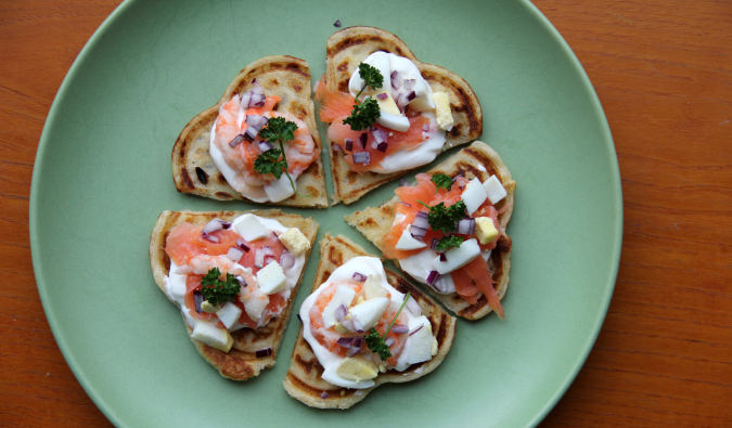 Toppings: Smoked salmon, cold, cooked shrimp, fresh parsley, diced red onion, chopped hard-boiled egg, crème fraiche, whipped cream, cloudberry jam, berries, powdered sugar