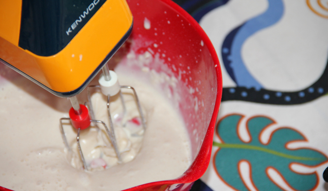Beat the mixture with an electric mixer, 2-3 minutes until completely smooth. You may also use a wooden spoon to beat the batter by hand, stirring until the batter is foamy and without any lumps.