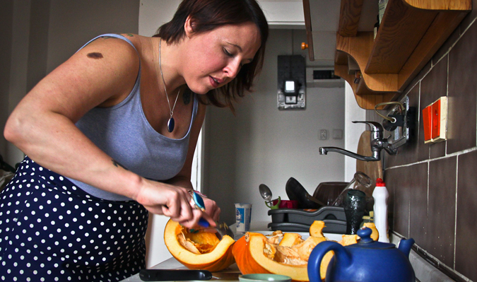 Preheat oven to 175°C. Cut the pumpkin into quarters. Scrape out the seeds and disard or save for roasting. Rub the pumpkin flesh with vegetable oil and place on a baking sheet flesh side up. Bake for approximately 1 hour or until fork-tender. Allow to cool a bit. Scrape the pulp from the pumpkin shell into a bowl. Mash with a fork then use an electric mixer to mix the pulp until it is smooth and no longer stringy.