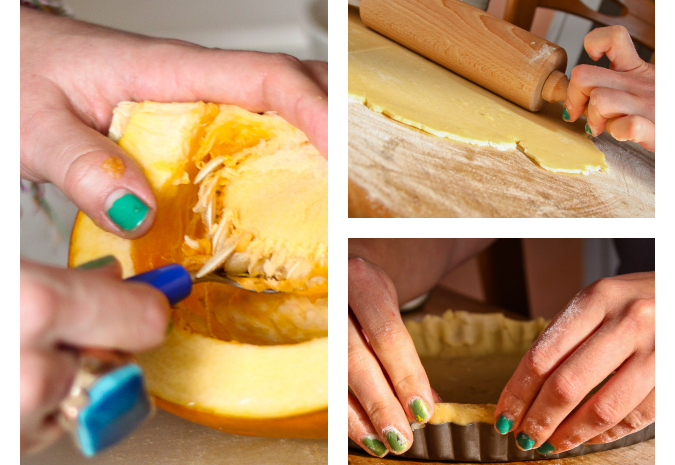 While the pumpkin is baking, make the crust. Combine the flour and salt in a mixing bowl, add the shortening. Mix well with a fork and gradually add the water 1 tbsp at a time until all of the flour is moistened and the dough is no longer sticking to the sides.